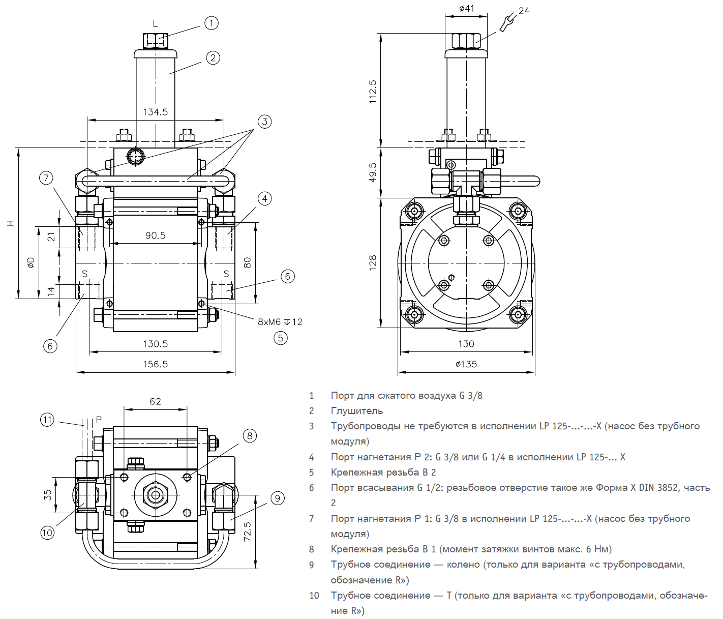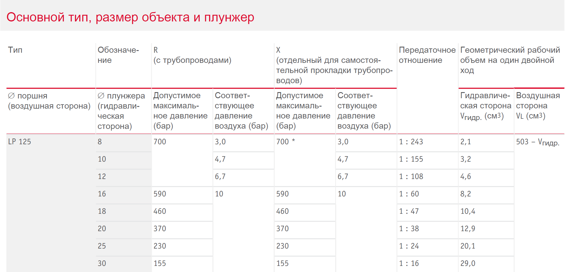 Гидравлические агрегаты с пневмоприводом представляют собой плунжерные насосы попеременной подачи с пневматическим приводом. Они работают как пневматический преобразователь давления с колебательным движением и автоматическим реверсивным управлением. Гидравлический насос с пневмоприводом типа LP может генерировать рабочее давление до 700 бар. Производительность зависит от настроенного давления воздуха и в настоящий момент действующего гидравлического противодавления. Она может падать до состояния останова насоса. Насос перезапускается автоматически, как только снизится гидравлическое давление у потребителя (поддержание напора).